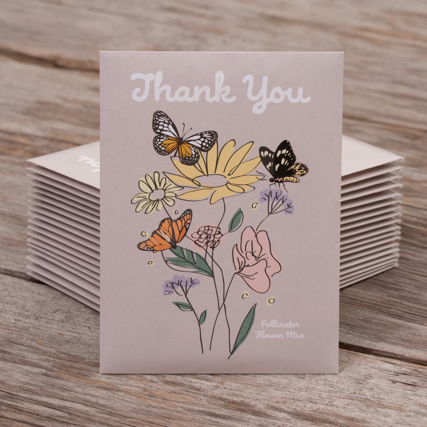 Pretty Thank-You favor packets to express your gratitude in an exceedingly beautiful way! Filled with a mix of seeds to grow a garden of beautiful, butterfly-attracting and nurturing blooms, these packets will show your appreciation all season long. Packet art is a neutral greige putty color with a simple flower and butterfly drawing.